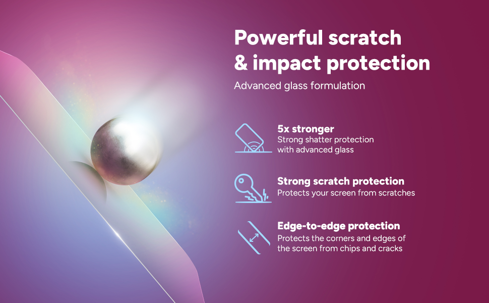 1 Tests conducted by a 3rd party independent lab; tested up to 5X stronger than traditional glass screen protection. 2 Recycled material is certified through a third-party mass balance allocation process.