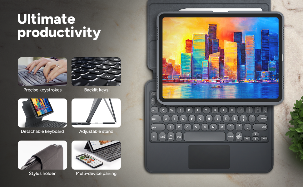 - Detachable Keyboard and Holder for Apple Pencil: The keyboard and case detach to accommodate different uses and environments. The holder for Apple Pencil keeps it, or any other stylus, close at-hand for when inspiration strikes.